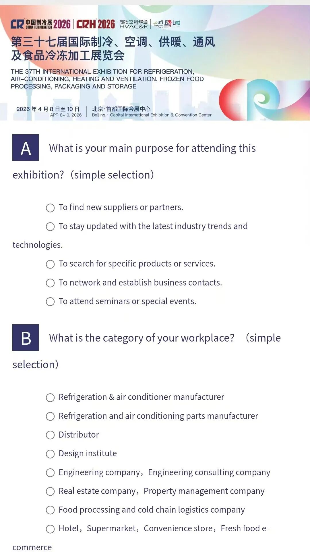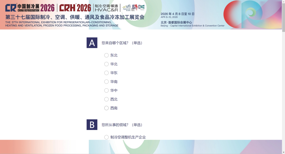 第三十七届国际制冷、空调、供暖、通风及食品冷冻加工展览会(简称“2026中国制冷展”)将于2026年4月8日至10日在北京·首都国际会展中心举办。本届展会以“数智塑冷暖,零碳启新程”(Empower refrigeration and heat pump with digital intelligence for a new chapter of carbon neutrality)为主题,设置A1、A2、B1、B2、B3五个展馆,总面积115,000平方米,预计将吸引全球近30个国家和地区的1,000余家企业和机构参展,80,000余名专业观众和买家参观洽谈,同期举办主题论坛、专题研讨会、技术交流会等70余场会议活动,更有多个主题示范专区精彩亮相。